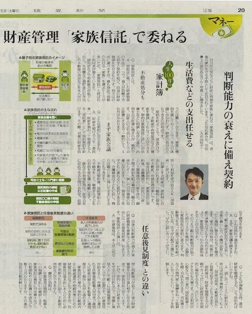 TOP > ニュース > ホームページ更新 > ホームページ更新 2025年10月25日 読売新聞 「なびライフSATURDAY」に家族信託の取材記事が掲載されました! 10月 30, 2025 メディア掲載情報一覧 ニュースの記事一覧へ 2100以上の法律記事から情報を検索! この記事を書いた人 宮田浩志(司法書士) 宮田総合法務事務所 代表司法書士 後見人等に多数就任中の経験を活かし、家族信託・遺言・後見等の仕組みを活用した「老後対策」「争族対策」「親なき後問題」について全国からの相談が後を絶たない。 詳しいプロフィールはこちら -ホームページ更新