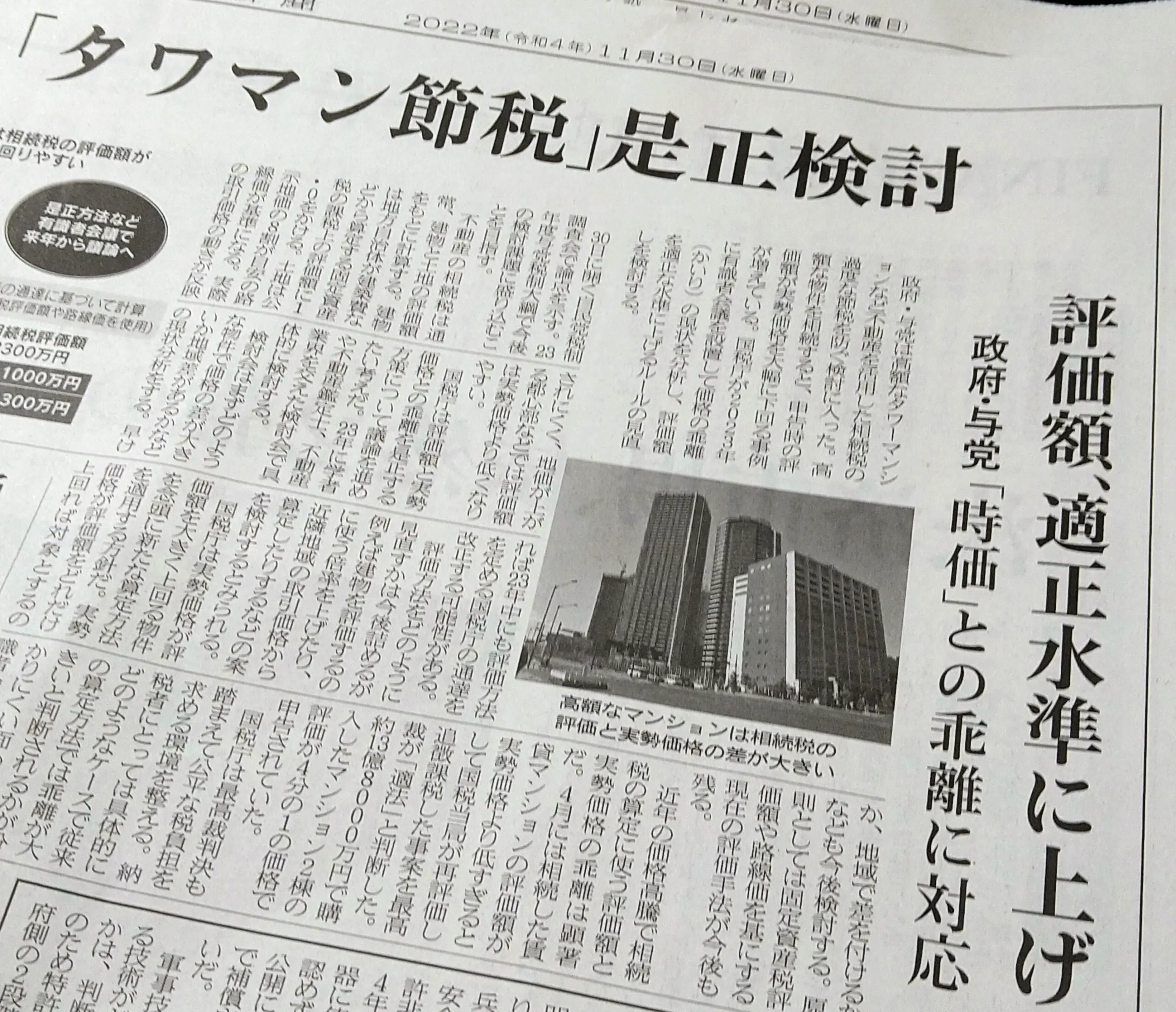 11/30付の日本経済新聞の朝刊記事によると、政府・与党は高額なタワーマンションなど不動産を活用した過度な相続税対策(いわゆる“タワマン節税”)を防ぐ検討に入り、2023年度与党税制大綱で今後の検討課題に盛り込むことを目指すという。